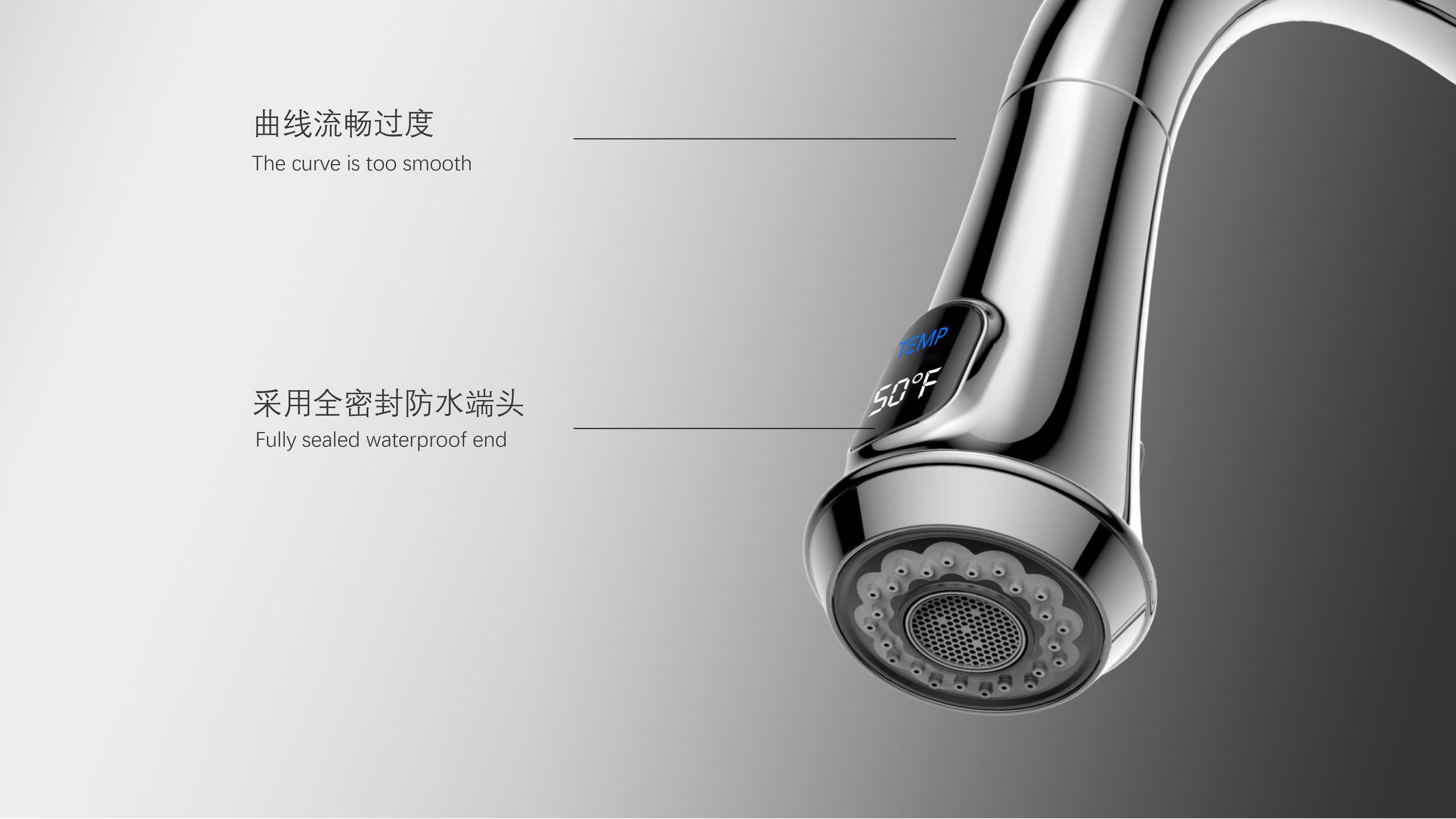 古典廚房龍頭;抽拉頭隨意抽拉多角度使用;采用全密封防水端頭;水力發(fā)電技術,智能芯片溫度數(shù)顯-冷水TEMP顯示藍色、溫水TEMP顯示綠色、熱水TEMP顯示紅色