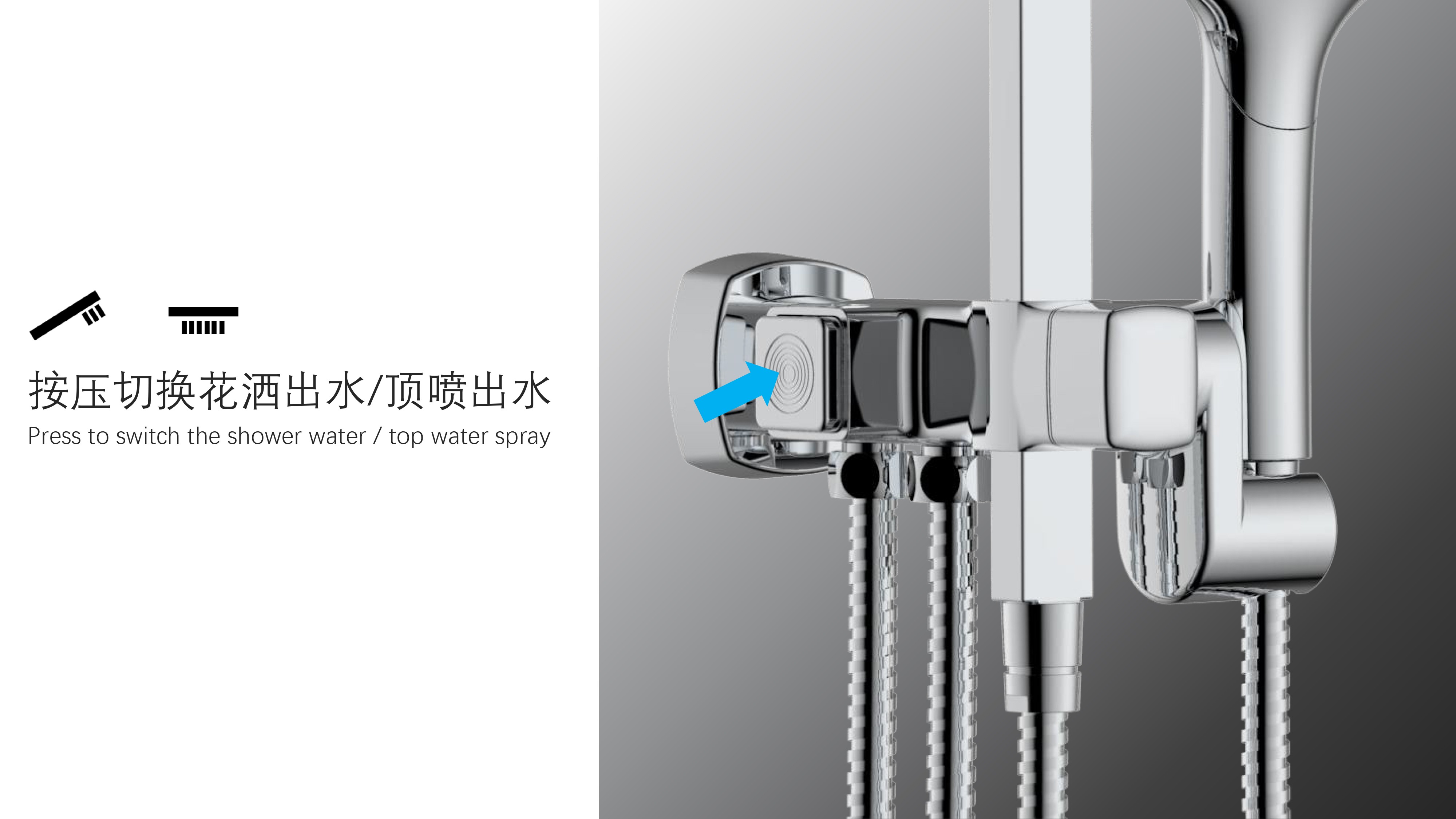 方形寬大頂噴;Z字形三通;按壓切換頂噴/花灑出水